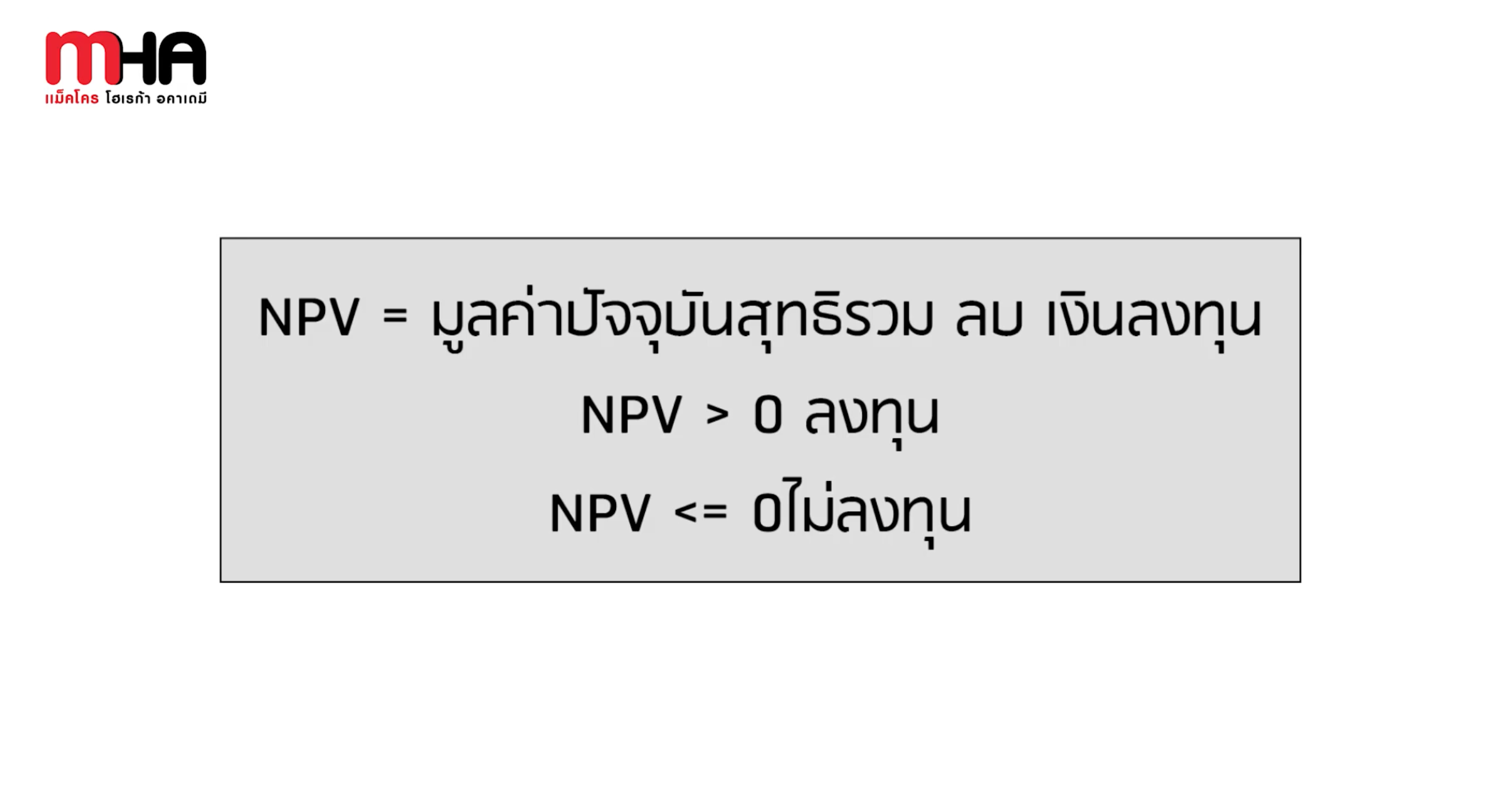 NPV > 0 สามารถลงทุนได้ ผลตอบแทนจากการลงทุนมีมากกว่า
