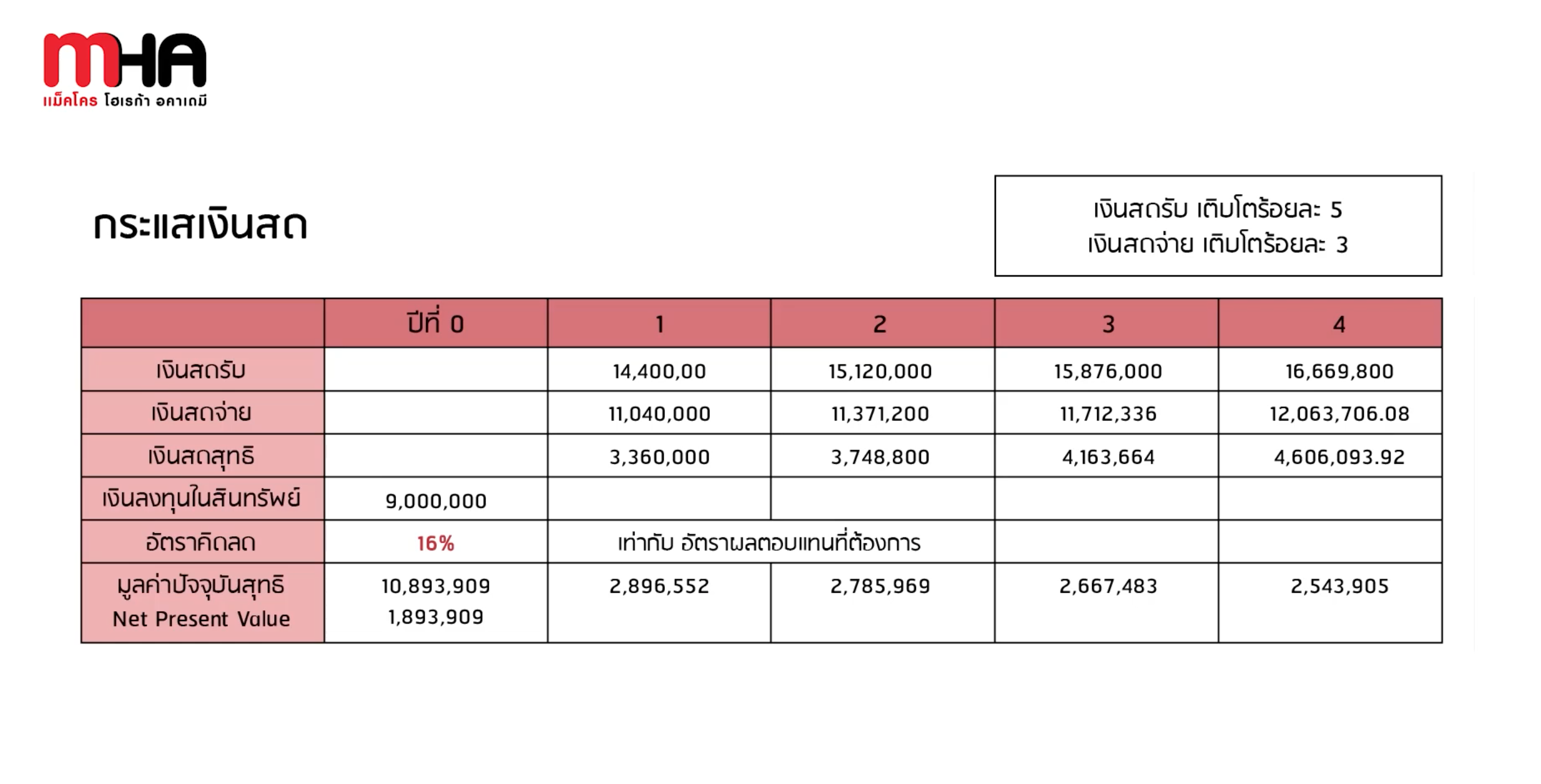 ‘กระแสเงินสดสุทธิ’ เพื่อนำมาหา ‘มูลค่าปัจจุบันสุทธิ’ (Net Present Value หรือ NPV คือ ผลต่างระหว่างมูลค่าปัจจุบันรวมของกระแสเงินสดรับสุทธิตลอดอายุโครงการกับมูลค่าปัจจุบันของเงินลงทุน โดยใช้ ‘อัตราคิดลด’ (discount rate) ตัวใดตัวหนึ่งมาปรับมูลค่าของกระแสเงินสดที่เกิดขึ้นในแต่ละช่วงเวลาให้มาอยู่ที่จุดเดียวกัน คือ ณ ปัจจุบัน)