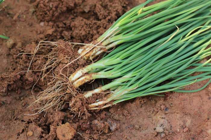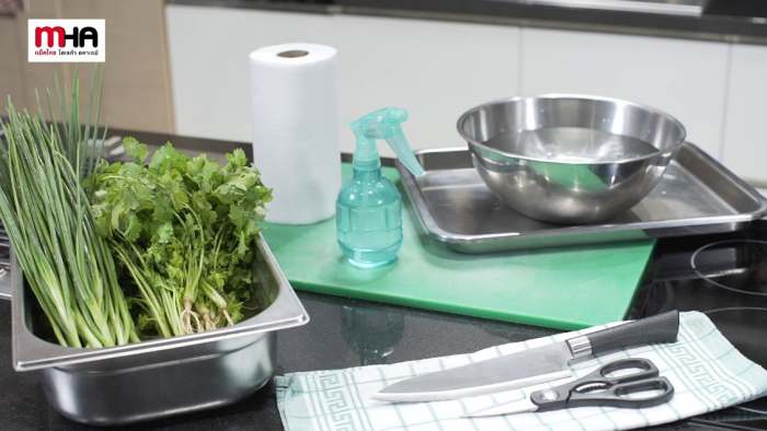 - สำหรับต้นหอม ให้ตัดรากออกให้เรียบร้อย ส่วนผักชีต้องใช้นิ้วขูดดินที่รากออกให้สะอาด
