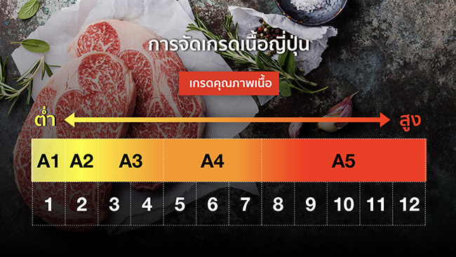 มาตรฐานการวัดระดับไขมันแทรกในเนื้อ มาตรฐานการวัดระดับไขมันแทรกในเนื้อ เรียกการวัดนี้ว่า BMS หรือ Beef Marbling Standard ไขมันที่แทรกอยู่ในกล้ามเนื้อนี้จะบ่งบอกเกรดของเนื้อวัว เกรดที่สูงจะมีปริมาณไขมันแทรกอยู่จำนวนมาก ความนุ่ม รสสัมผัส ก็จะอร่อยมากกว่า และราคาก็จะแพงมากขึ้น การวัดมาตรฐานมีการให้คะแนนที่เรียกว่า Beef Marble Score โดยในประเทศญี่ปุ่นได้กำหนดมาตรฐานเกรดเนื้อวากิวไว้ถึง 12 ระดับ ตั้งแต่ระดับ 1 หมายถึงชิ้นเนื้อแดงที่ปราศจากไขมันแทรกปน จนถึงระดับ 12 ที่เนื้อสเต็กมีไขมันกระจายอยู่ในชิ้นเนื้ออย่างทั่วถึงและสวยงาม เนื้อเกรดพรีเมียมอยู่ที่ A5 หรือเนื้อที่มีไขมันแทรกระดับ 8 ขึ้นไป