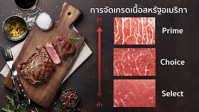 - Prime หรือชั้นดีเยี่ยม เป็นเนื้อที่ผู้บริโภคยอมรับมากที่สุด และมีความอร่อยมาก เป็นชิ้นส่วนที่ได้จากวัวที่ยังอ่อน ได้รับการเลี้ยงดูดี ทำให้ได้เนื้อที่มีคุณภาพดีเยี่ยม เนื้อจะมีส่วนไขมันแทรกกระจายอยู่ทั่วไป ทำให้เนื้อมีความนุ่ม ชุ่มน้ำ และรสชาติดี