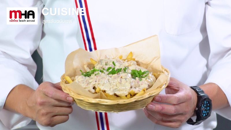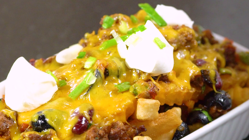 - นำเฟรนช์ฟรายส์ใส่ภาชนะ พร้อมราดทอปปิ้งที่เราทำในข้อ 2 โรยด้วยเชดดาชีสขูด แล้วนำเข้าเตาอบไฟบน 5 นาที ใช้อุณหภูมิ 180 °C เพื่อให้ชีสละลาย โรยหน้าด้วยซาวครีม ต้นหอม เป็นอันเสร็จ