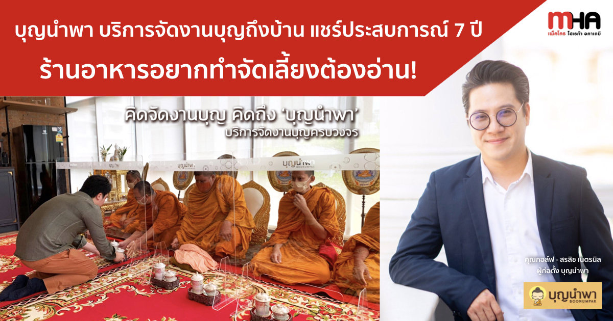 ‘บุญนำพา’ ถือเป็นผู้ให้บริหารจัดงานเลี้ยงทำบุญ (Catering) แถวหน้าของเมืองไทย ด้วยยอดจัดงานมากถึง 300 งานต่อเดือนในปีที่ผ่านมา ซึ่งส่งผลให้มีมูลค่าหลักสิบล้านต่อเดือน โดยปัจจุบันได้ยกระดับการบริการสู่ One Stop Service Catering พร้อมกับแตกไลน์บริการอย่าง อาหารสำเร็จรูปแช่แข็ง Mr.Chon และล่าสุดเปิดพื้นที่ออฟฟิศเป็นร้านอาหารเพื่อให้ลูกค้าสามารถแวะลองลิ้มชิมรสชาติอาหารก่อนได้ สิ่งสำคัญที่ทำบุญนำพายืนหยัดเข้าสู่ปีที่ 7 มาจากการวางแผนและสร้างระบบให้แข็งแกร่ง จึงชวนไปเจาะเบื้องหลังในการสร้างธุรกิจของ คุณกอล์ฟ - สรสิช เนตรนิล ผู้ก่อตั้งบุญนำพา ให้เติบโตและมีการพัฒนาบริการอย่างไม่หยุดนิ่ง