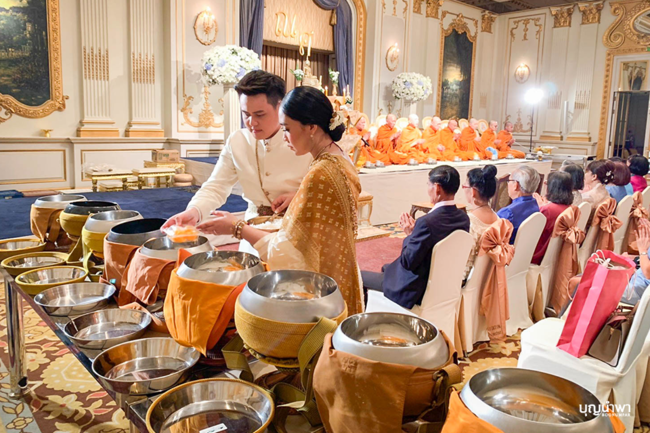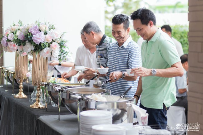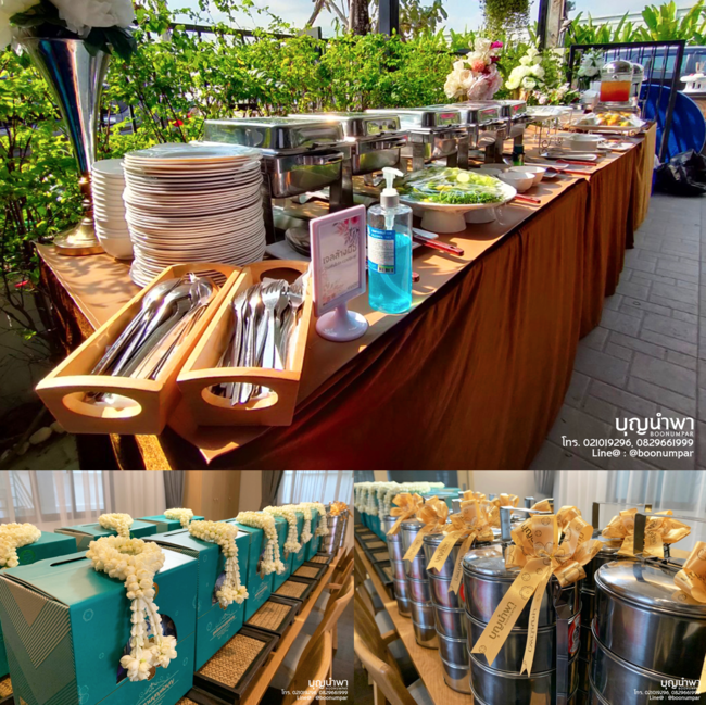 แล้วมาขยับขยายมาจับธุรกิจแคเทอริ่งได้อย่างไร คุณกอล์ฟ : แคเทอริ่งเป็นปัญหาที่เรานำมาแก้ไข เมื่อรับจัดงานทำบุญไปเรื่อยๆ เรื่องที่เราควบคุมไม่ได้คืออาหาร ไม่สามารถควบคุมคุณภาพ การบริการของพนักงานได้ มีฟีดแบ็กจากลูกค้ากลับมาว่าอาหารรสชาติไม่อร่อย บริการไม่ดี ซึ่งเขาไม่ได้จำว่าเราไปใช้คนอื่น แต่จำว่าบุญนำพาอาหารไม่อร่อย พอเกิดปัญหาเราก็เลยเซ็ตแคเทอริ่งขึ้นมาเอง ผมเป็นคนชอบทำครัวอยู่แล้ว เลยทดลองว่าจำนวน 10 หัว 100 หัว 1,000 หัว ต้องเตรียมปริมาณเท่าไร แคเทอริ่งไม่ได้เพิ่ม 10 เท่า เพิ่มเป็นสเกล อันนี้เราเรียนรู้เก็บข้อมูลมา 7 ปี ว่าเมนูนี้ 1,000 หัวต้องเตรียมเท่าไร จนปัจจุบันสามารถทำเป็นระบบคลิกเดียวก็รู้แล้วว่าต้องเตรียมเท่าไร เพราะเก็บข้อมูลไว้ในระบบคลาวด์ นี่คือจุดเริ่มต้นของการทำบุญนำพา