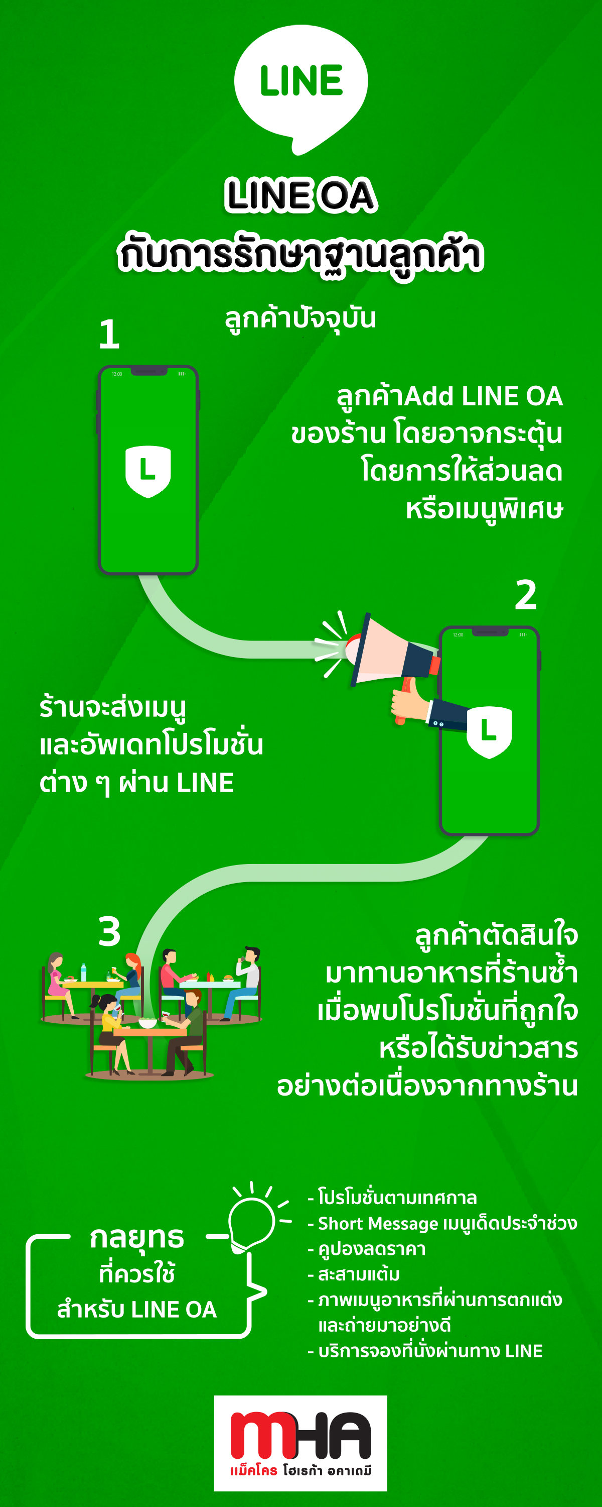 จริงอยู่ แม้ว่าลูกค้าจะสามารถ Add LINE ของร้านอาหารได้ก่อนที่จะไปใช้บริการ แต่ก็มีเพียงส่วนน้อยเท่านั้นที่จะทำเช่นนั้น เว้นแต่จะเป็นร้านที่มีบริการ Delivery ซึ่งลูกค้ามักจะสั่งผ่านไลน์หรือ Application อื่นมากกว่า ดังนั้น LINE OA จึงได้ผลมากในกรณีที่ลูกค้าเคยมาใช้บริการที่ร้านแล้ว และเห็นโปรโมชั่นที่ถูกใจเพื่อแลกกับการ Add LINE OA ของทางร้าน จากนั้นทางร้านจะสามารถติดต่อ กระจายข่าวสาร โปรโมชั่นต่างๆ ผ่านทาง LINE OA ได้ ซึ่งจะช่วยกระตุ้นให้เกิดการซื้อซ้ำหรือใช้บริการซ้ำ (Loyalty) ได้เป็นอย่างดี รวมถึงรักษาความสัมพันธ์ที่ดีกับลูกค้า ตาม Infographic นี้